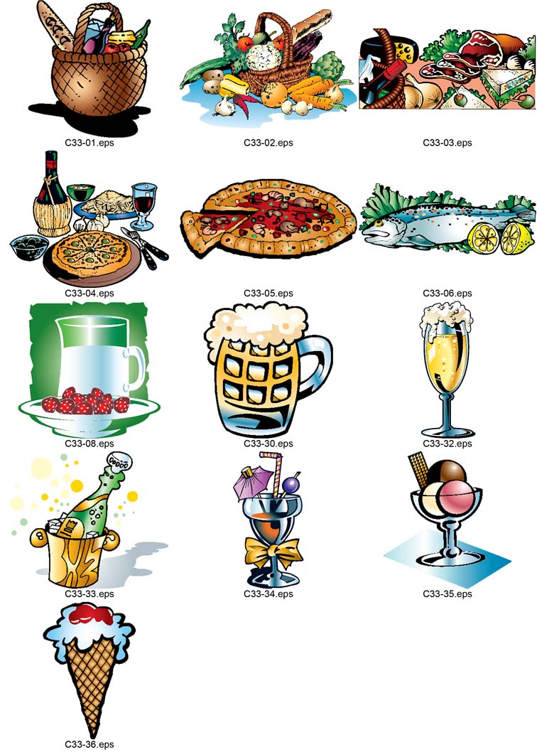 Векторные натюрморты с продуктами притания: овощи, пицца, рыба, вино, коктейли, ягода, шампанское, пиво в кружке, мороженое.